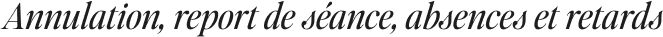 Merci de me prévenir au minimum 48 heures à l’avance en cas d’annulation ou de report, sauf cas exceptionnels. Ce délai permet de proposer ce créneau à d’autres patients. Les rendez-vous non honorés ne sont pas facturés, mais après 2 annulations faites moins de 48 heures avant (sauf cas exceptionnels), je ne prendrai plus de nouveaux rendez-vous.